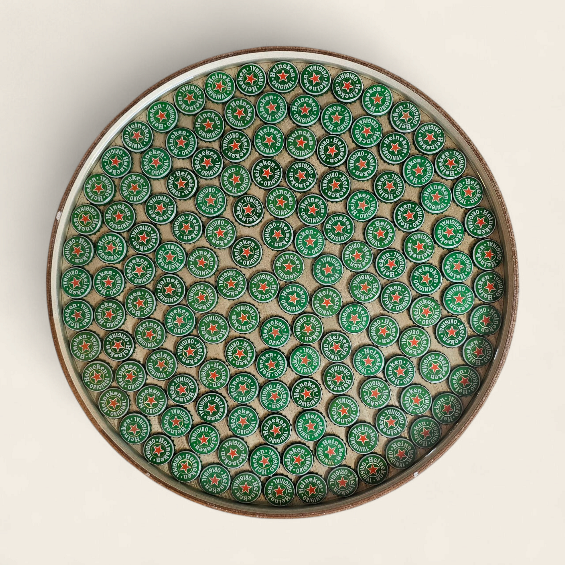 Bei diesem Couchtisch sind die Bierdeckel in Epoxidharz gegossen.