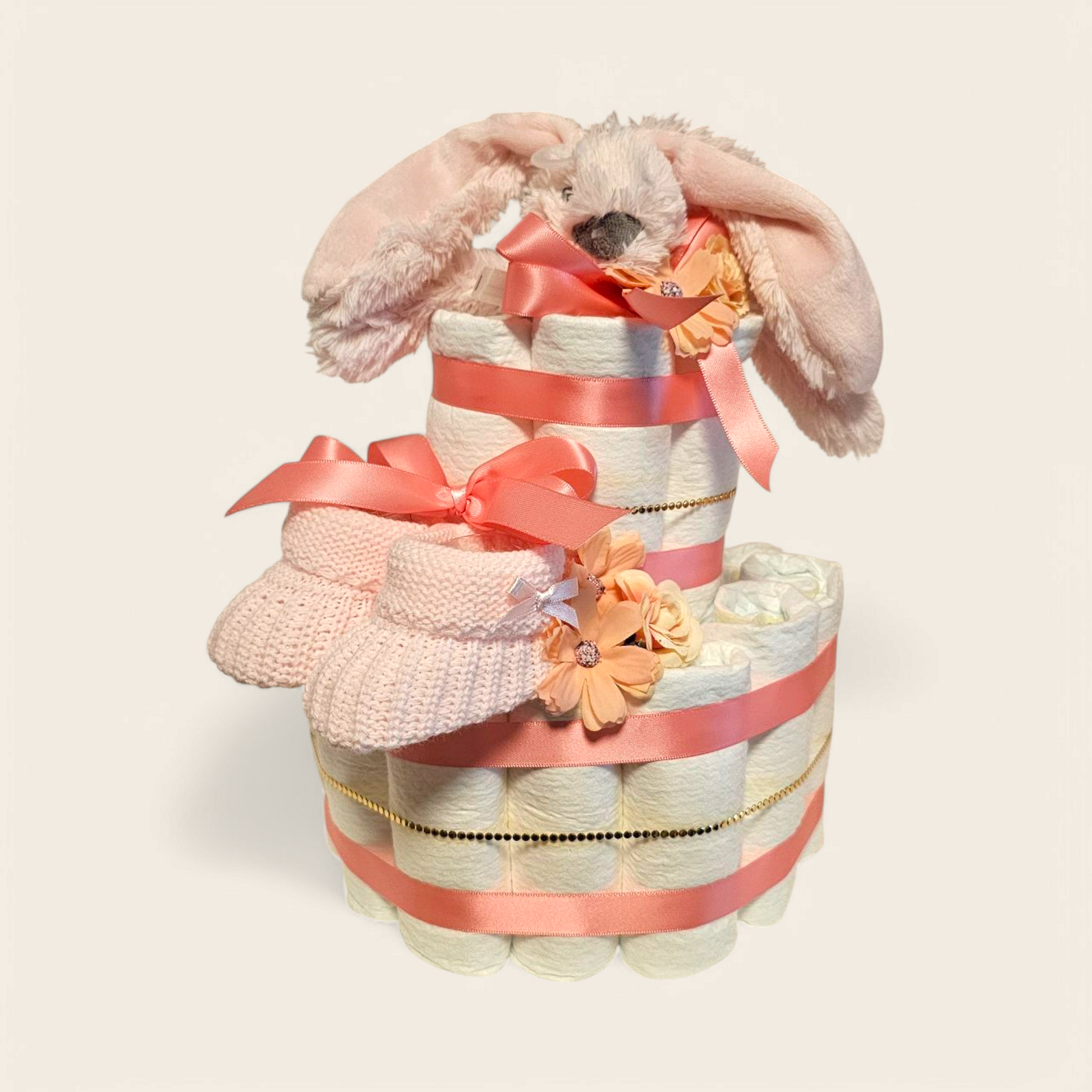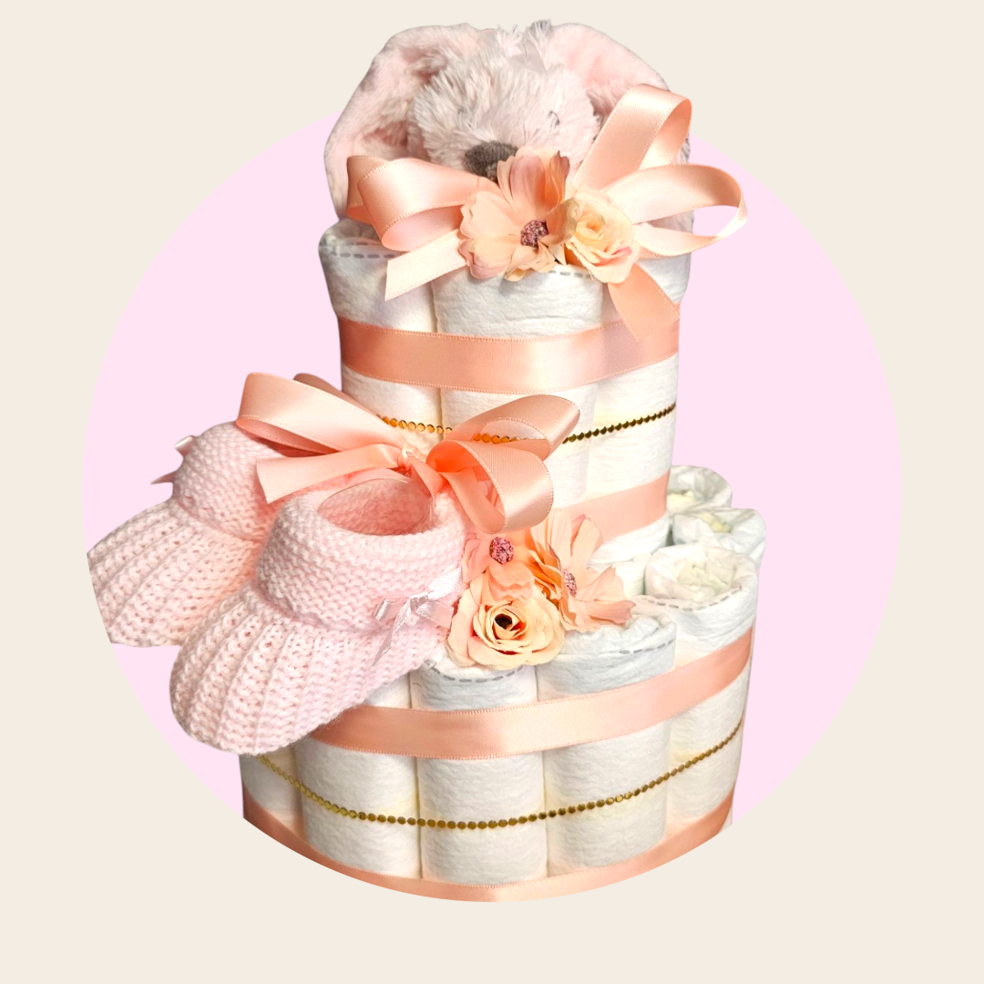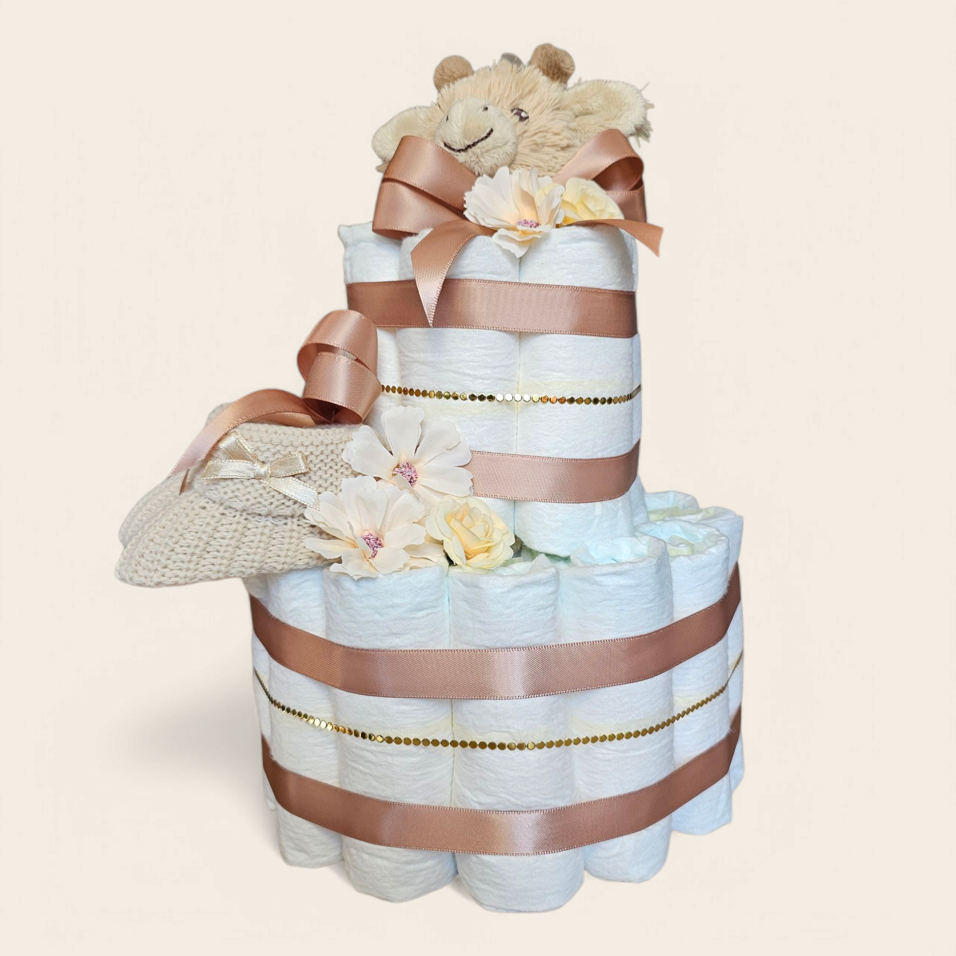 Voor een 2-laagse taart gebruik je 21 luiers voor de onderste laag en 7 voor de bovenste.
