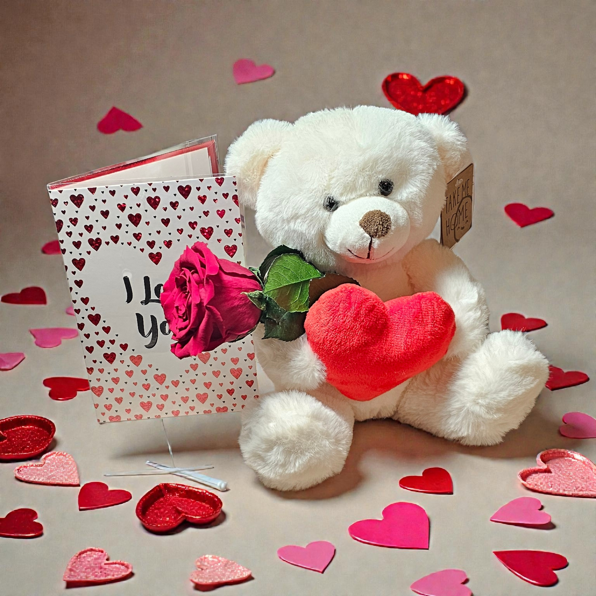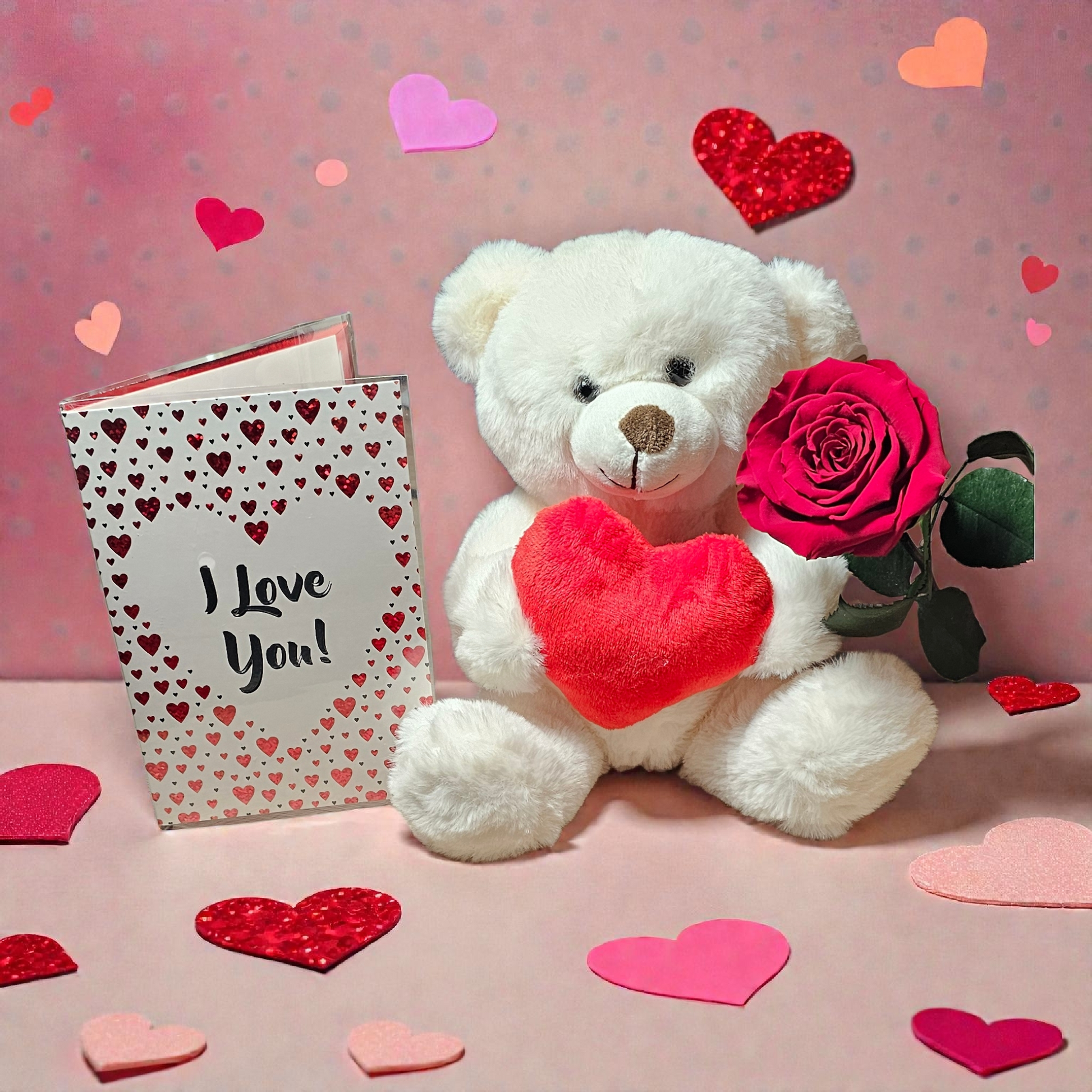Witte Zittende Knuffelbeer (ca. 20 cm) met Hart, Rode Longlife Roos & Kaart – Romantisch Valentijnscadeau