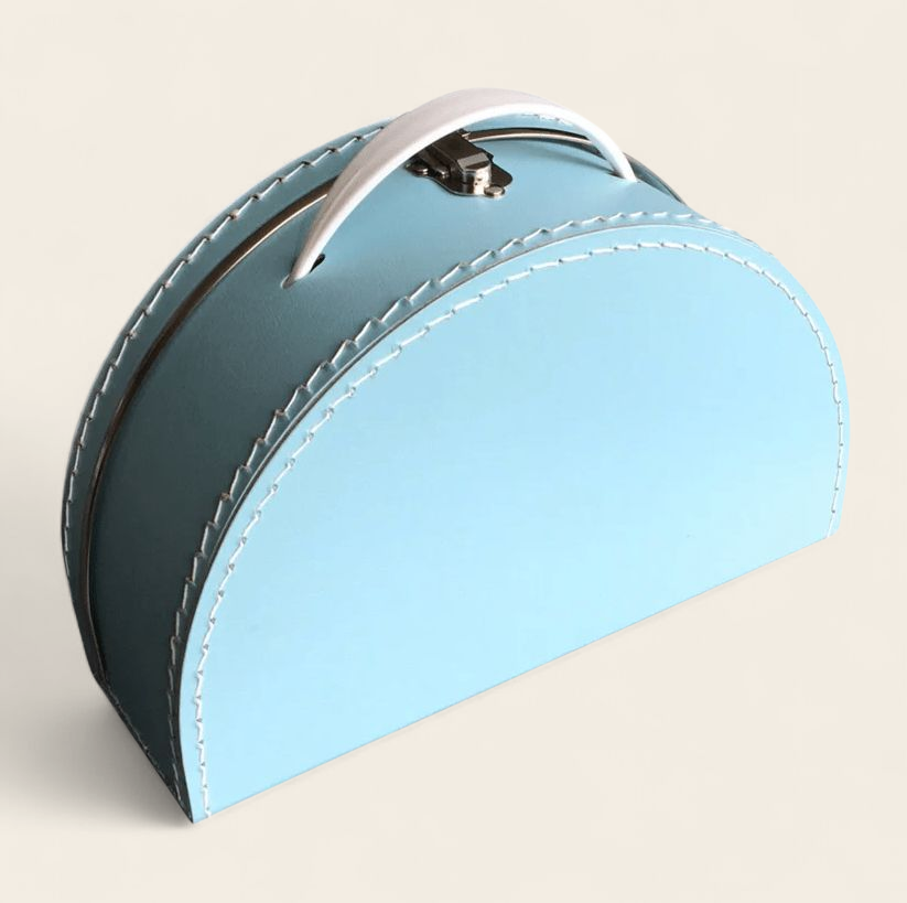 Gemaakt van stevig gelamineerd karton met metalen handvat en sluiting, is dit koffertje niet alleen mooi om te zien, maar ook praktisch in gebruik. Ideaal als kraamcadeau, babyshowercadeau of logeerkoffertje.