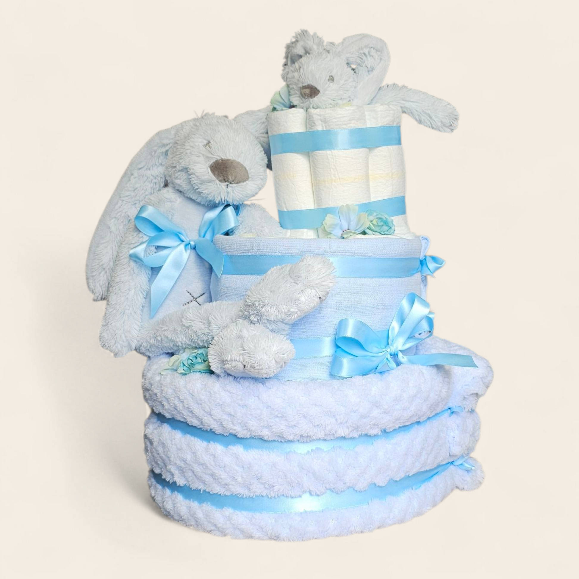 Luiertaart 3 laags blauwe met Rabbit Richie – Perfect Kraamcadeau