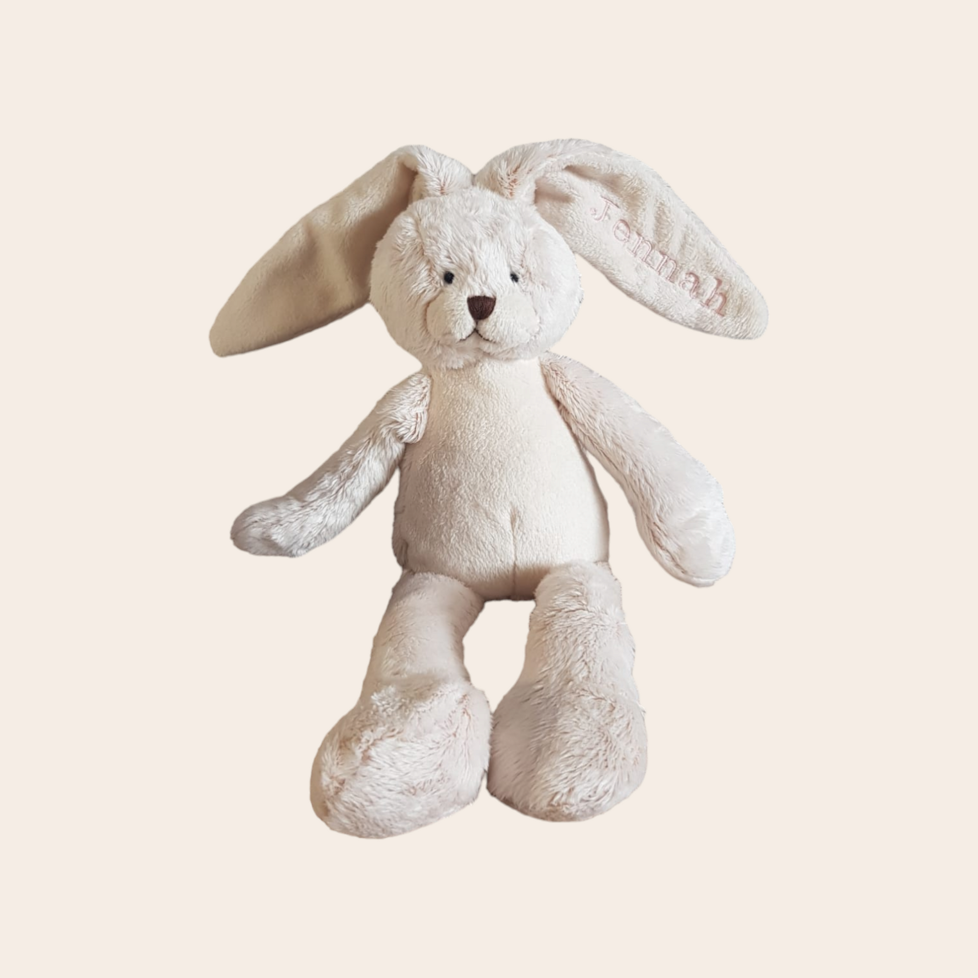 - Personaliseerbaar: Maak dit knuffelkonijn uniek door de naam van je kind erop te laten borduren. Een persoonlijk tintje dat ideaal is voor cadeaus en speciale gelegenheden.