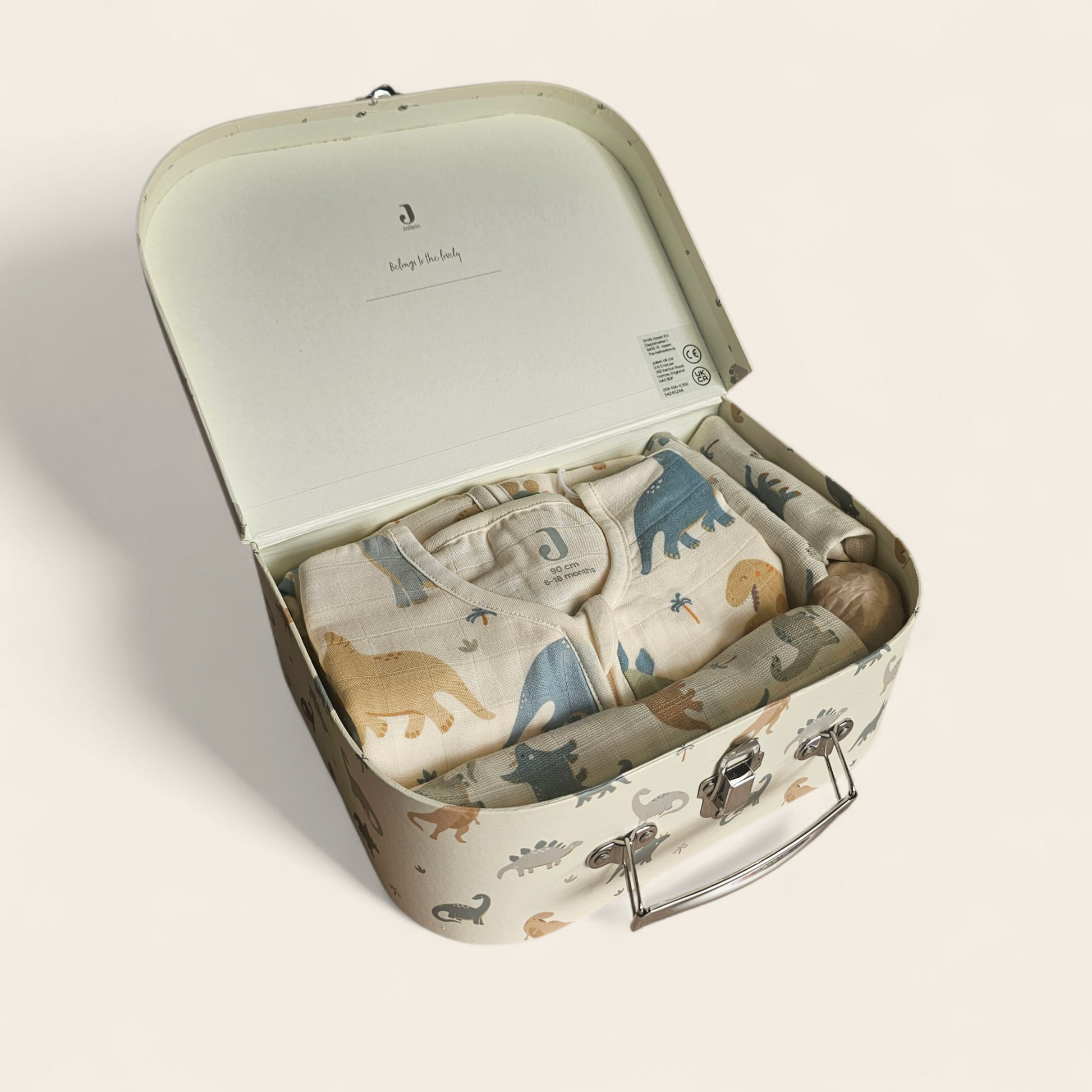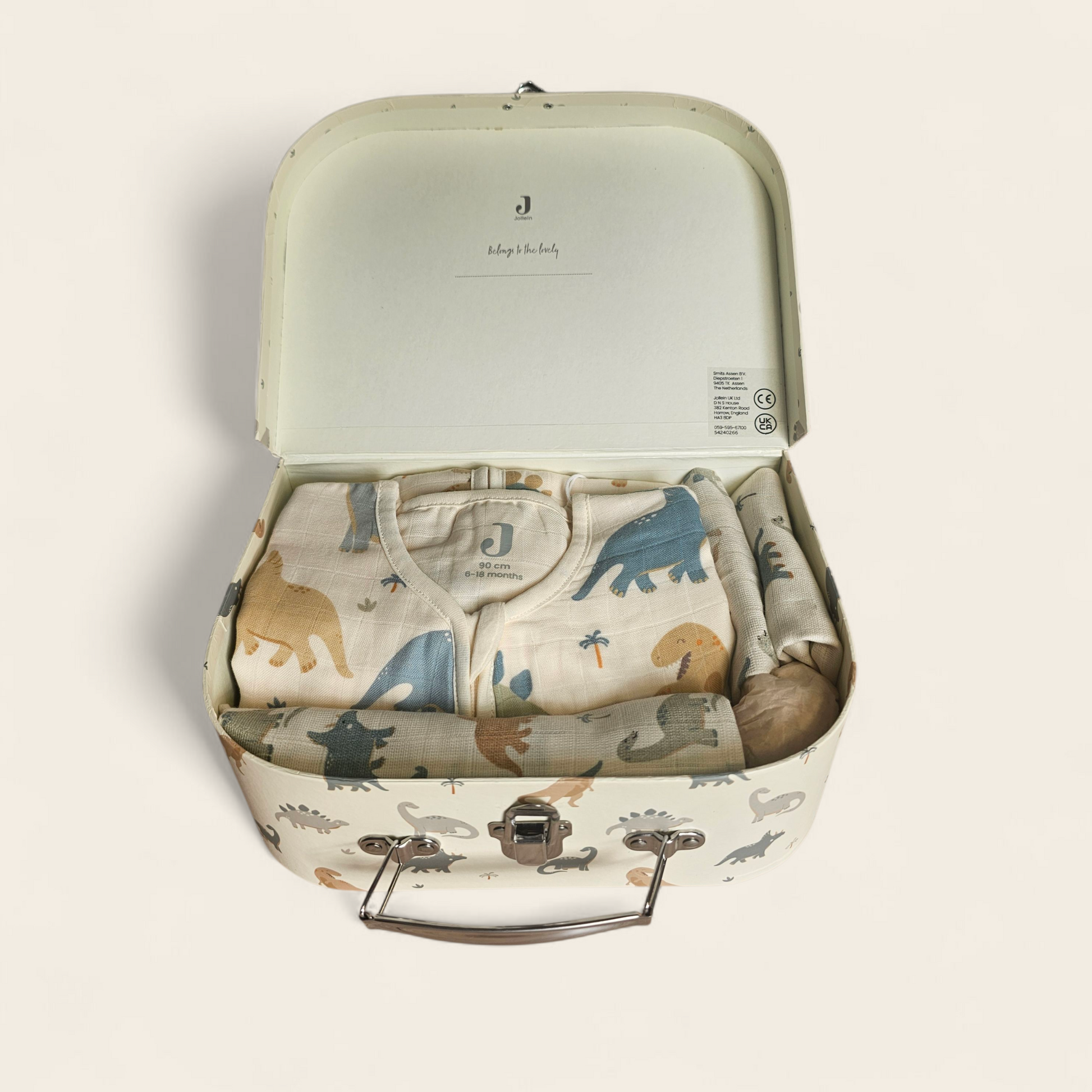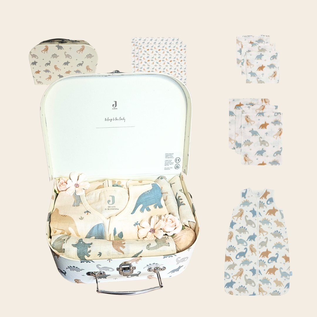Kraamcadeau Dino – groot koffertje met Jollein slaapzak en babyartikelen
