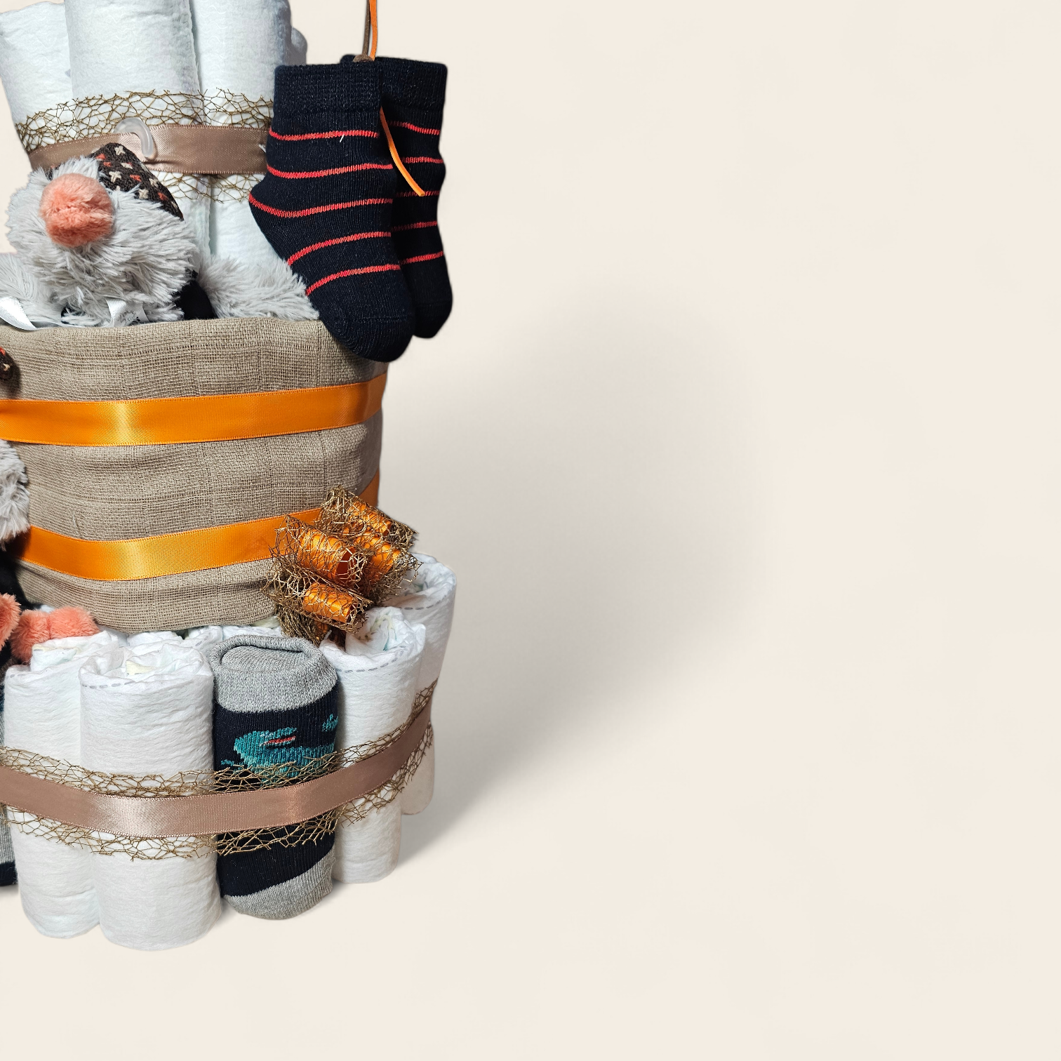 Deze luiertaart van 3 lagen is met zorg handgemaakt en bevat maar liefst 56 luiers, aangevuld met 4 paar babysokjes, 1 hydrofiele doek, een zachte Penguin Polar knuffel én een bijpassende Penguin Polar Tuttle van Happy Horse. Alles wat ouders in de eerste maanden nodig hebben, stijlvol samengebracht in één luxe cadeau.