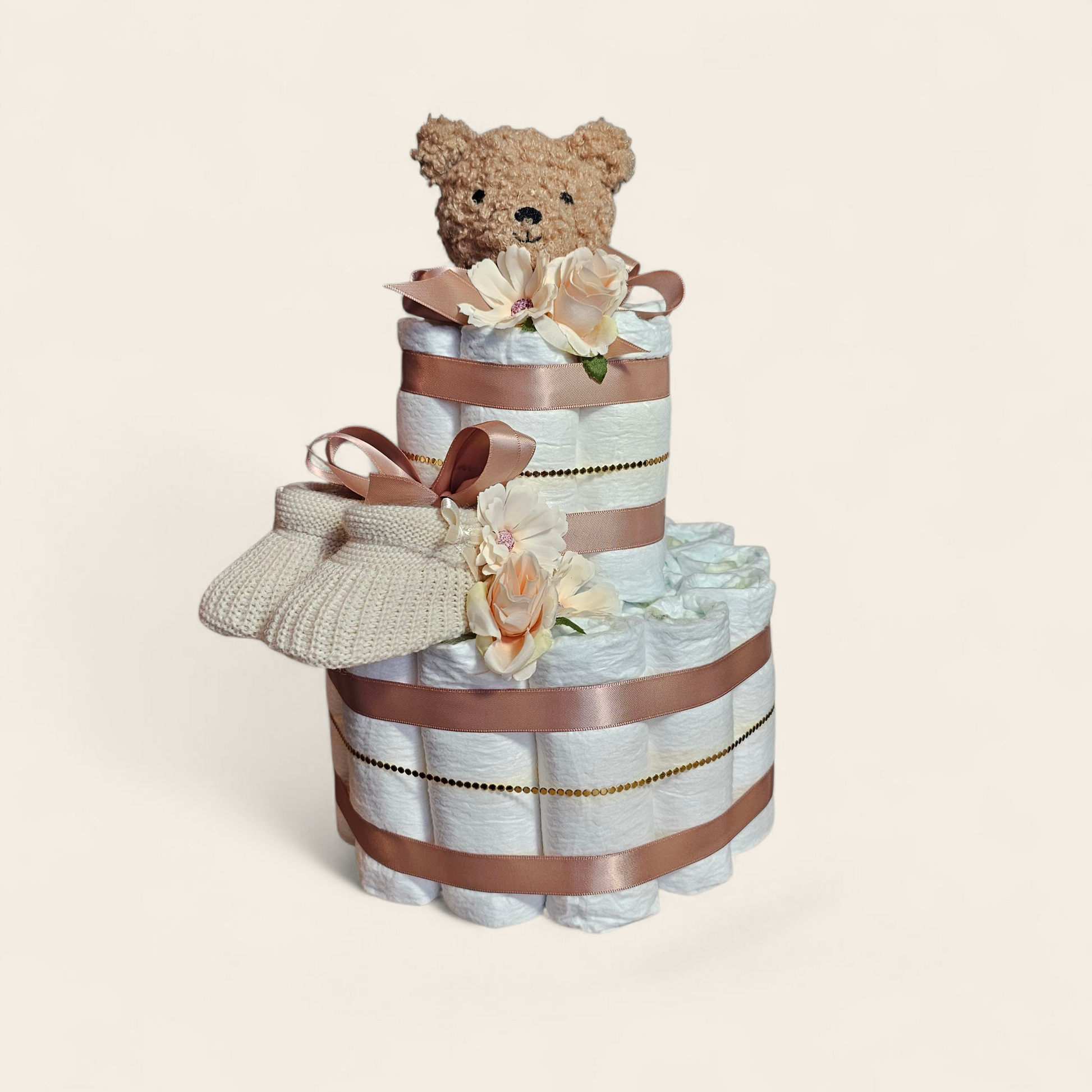 Onze luiertaarten worden met de hand gemaakt. Elke laag bestaat uit zorgvuldig opgerolde Pampers luiers, stevig vastgemaakt en versierd met stijlvolle linten. De top van de taart wordt gesierd door de knijpspeeltje bruine beer, en de schattige bruine slofjes worden zorgvuldig aan de zijkant bevestigd.