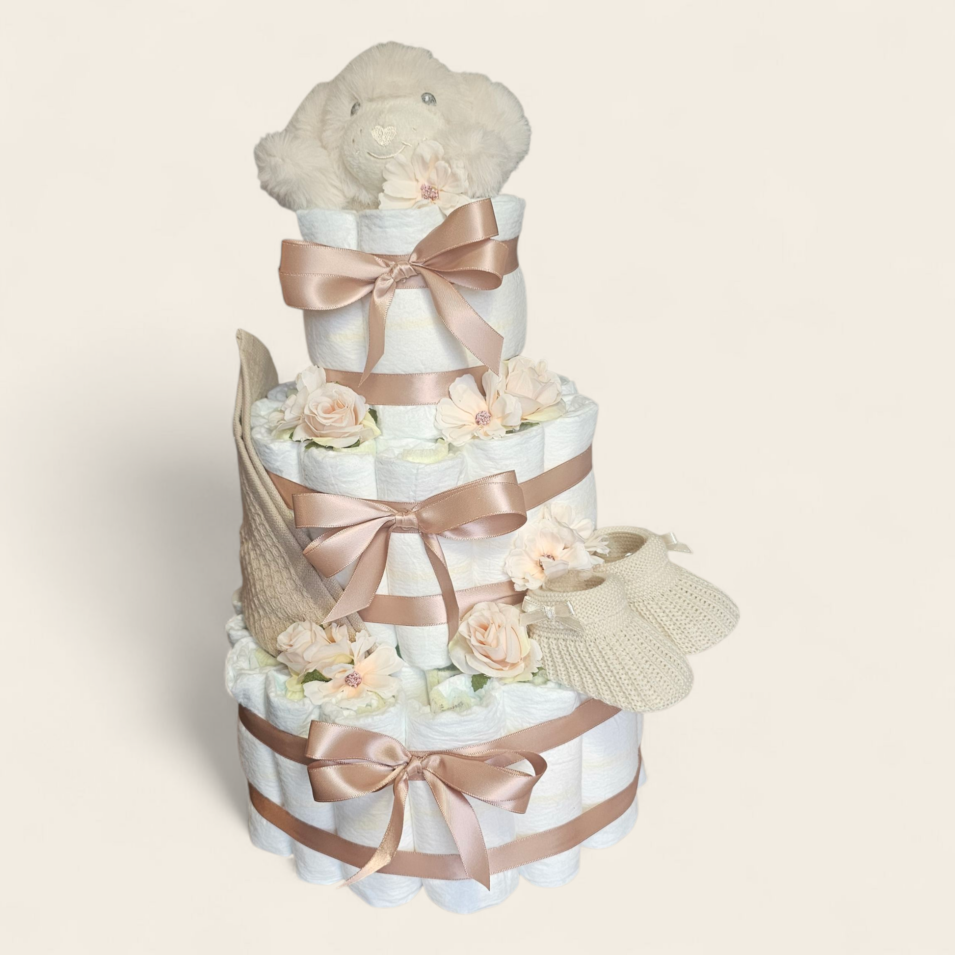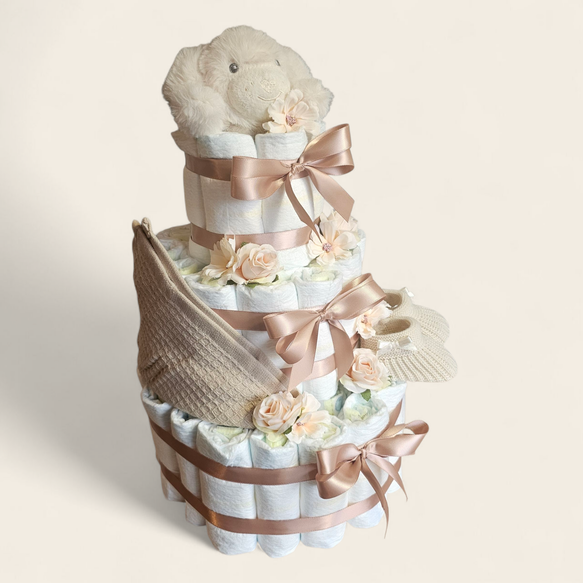 De neutrale bruine tinten maken deze luiertaart geschikt voor zowel jongens als meisjes.